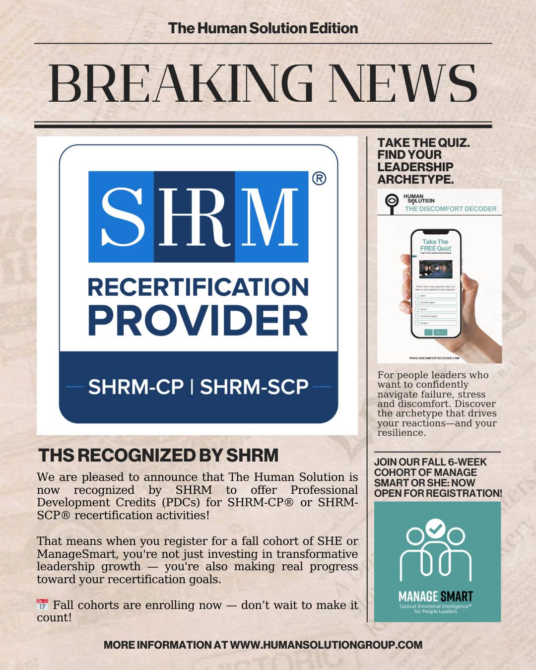 Leadership isn’t just a title. It’s a skill. And too often, managers are promoted for their individual contributions—then left to figure out leadership on their own. That’s a recipe for burnout, discomfort, and a whole lot of stress. At The Human Solution, we believe management is a professional skill set in its own right. And if you want to build high-performing teams and create a culture that thrives, your managers need the right tools—not just instincts.
